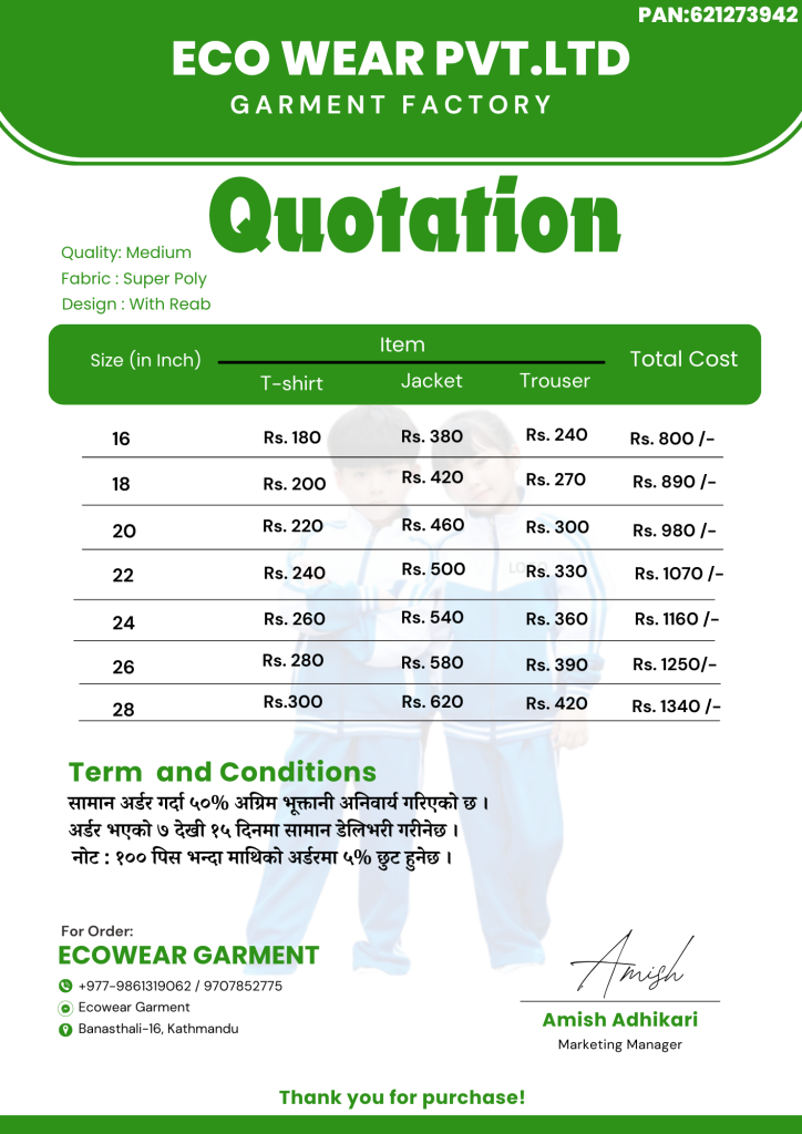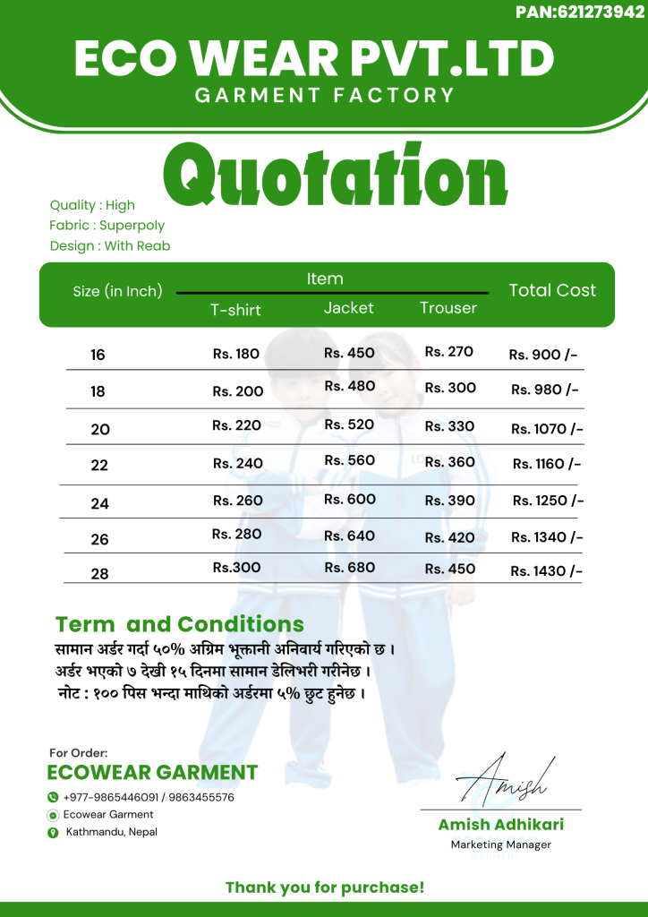 Price Quotation for School Uniform as per Quality.